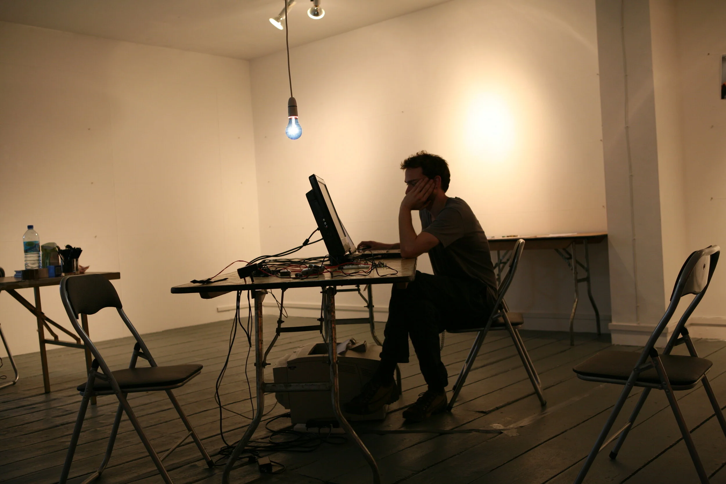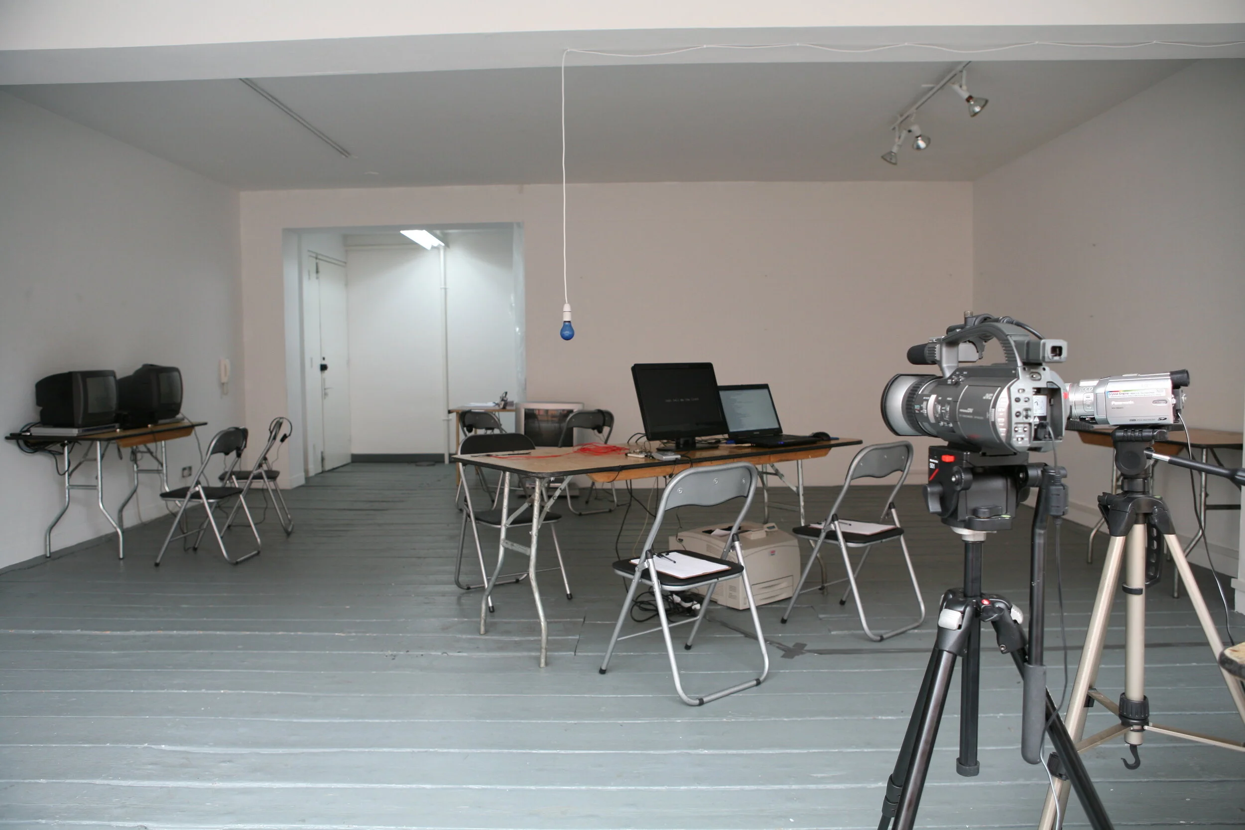 The questions focused on truth telling and a number of the questions specifically related to what it means to be an artist working in the current circumstances of the studio/gallery/museum/funding mechanisms and how this relates to the way an artist might construct their identify. A wall based exhibition comprising of photos and a lie detector print outs unfolded temporally as each interview took place. Audience members could freely wander amidst the laboratory like environment but were discouraged by a hostess from talking to any of the cast and advised not to touch any equipment and to remain silent at all times. The audience were an important part of the performance being both present and not present at the same time.